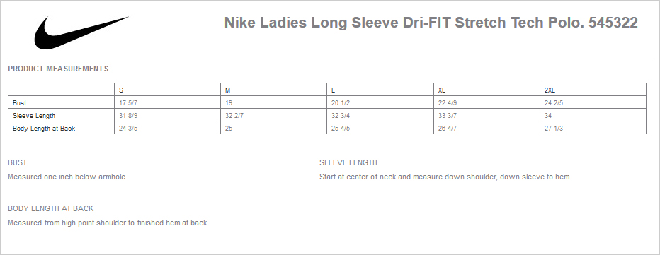 Dri-FIT moisture management technology and stretch fabric make this long sleeve polo a true performer for her. Tailored for a feminine fit with a self-fabric collar, five-button placket and open cuffs. Heat transfer label for tag-free comfort. Dyed-to-match buttons on White and Black. White buttons on Varsity Red, Anthracite and Blue Sapphire. Side vents. The contrast Swoosh design trademark is embroidered on the center front, below the placket. Made of 5-ounce, 100% polyester Dri-FIT fabric.